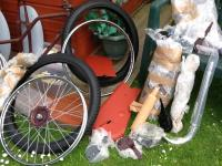 Autocycle Parts for sale. 1 pair of valanced mudguards, 2 pairs of pre ‘56 mudguards, 1 re-style frame with forks, 2 pre ‘56 bare frames and 2 rear carriers.